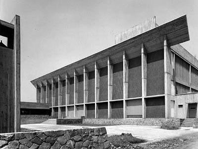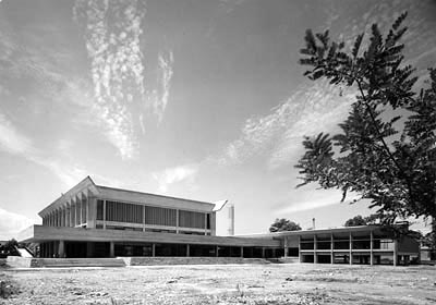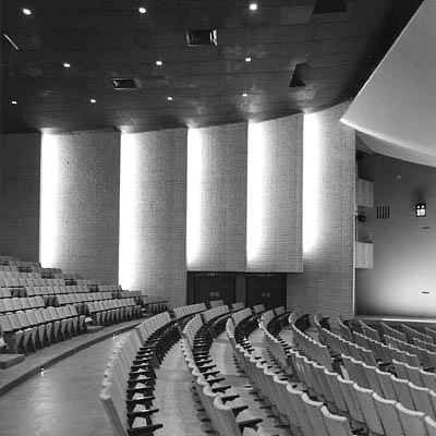 われわれが、八代市厚生会館の設計の機会に恵まれたとき、オーディトリアムの空間をいかにしてつくるか、ということを考えた。何回かのディスカッションの結果、次のような結論をえた。精度の高い音響的空間は構造空間とかならずしも一致させる必要はない。とくにオーディトリアムには側廊をとる必要から、構造の内側をそのまま内部の空間とすることは困難である。そのため、4m間隔の薄べったい柱により縦の線を強調し、外部空間へのリズムとし、横方向のつなぎとして、柱と梁との接合部に大きな傾斜のあるつなぎ梁をいれることにしてみた。南九州の強烈な陽ざしをうけて、光と陰が、折版構造のよりもさらに強く変化をあたえてくれるだろうという期待もあった。 |