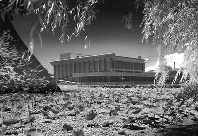 自律的な外部空間の獲得を目指す芦原の建築手法が、ここでは殆どそれと意識されないほどしっくりと周囲の環境に溶けあい、おちついた雰囲気がつくり出されている。苔むした八代城趾の石垣と蓮の生い茂る濠、周囲の緑などが、芦原が外部空間に対して要求する建築とのコネクター的な役割以上のものを提供しており、彼はこれらを存分に利用しながら、石垣と対抗しうるような新しいランドマークの創造を目指したのであった。 |