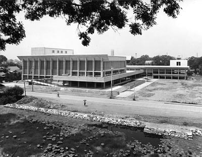 われわれがこの設計でまず考えたことは、単なる一つの建物としてまとめるだけでなく、この付近に市民のコアをつくることであった。そのためには風致公園全体として敷地を把握する必要があった。 建物全体を与えられた敷地の南側によせ、北側に前庭をとれば、建物は公園全体の一隅を仕切る形となり、庭園部分の広がりは切断されずにすむばかりでなく、八代城趾の最も美しい眺めは建物でさえぎられることもなくなる。いやむしろ、厚生会館のあちこちの室から、この美しい眺めをさらに視点の高さを変えて満喫することすらできる。 |